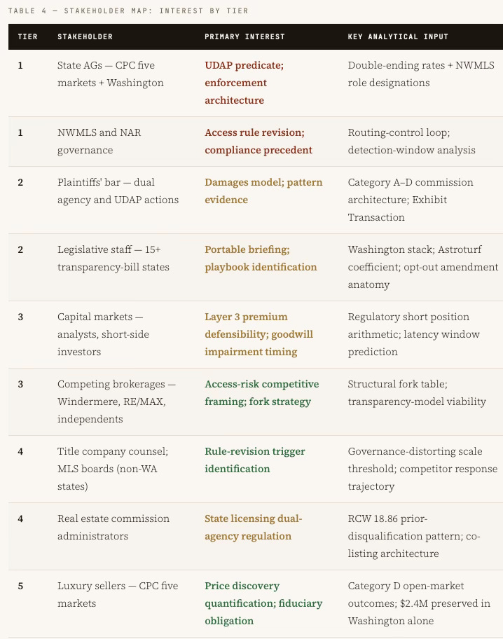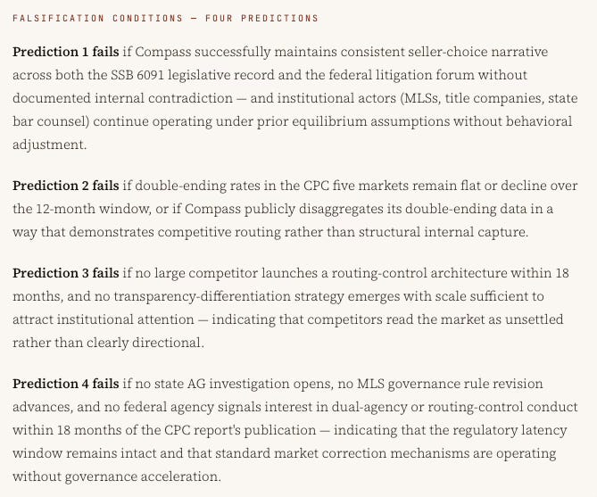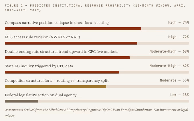 The publication also reaches institutional subscribers — government bodies, regulatory agencies, and market research organizations — for whom the predictive architecture carries operational value beyond the Compass-specific analysis. A framework that models how dominant brokerages behave under regulatory pressure applies to any market where listing-side concentration and dual-commission incentives converge.