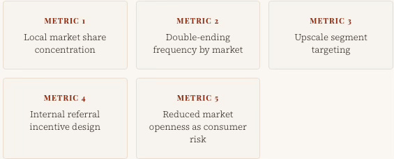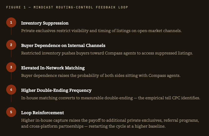 The report’s strongest move is conceptual. Treating double-ending not as a side issue but as a possible mechanism of consumer harm reframes the analysis. The concern shifts from Compass merely being large to Compass potentially using private exclusives, referral incentives, and internal routing to increase the odds of capturing both sides of the transaction. That framing links market structure to household-level effects — weakened price discovery for sellers, reduced access for buyers, and brokerage incentives that diverge from the consumer’s stated objective.