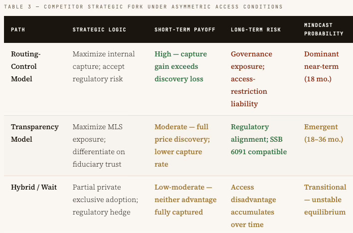 Prediction 3 — Competitor Structural Fork. Competing large brokerages face a structural fork under asymmetric access conditions, not a simple imitation choice. Firms operating in markets where Compass holds significant private-exclusive inventory face a binary decision: adopt routing-control architecture to maintain inventory access, or defect toward a transparency strategy and differentiate on open-market trust signals. Herding toward the routing-control model accelerates under regulatory uncertainty — when firms cannot assess enforcement probability, the highest visible payoff strategy dominates. Expect 12–18 months of herding behavior before a transparency-strategy competitor emerges with sufficient scale to make the fork legible to institutional observers.