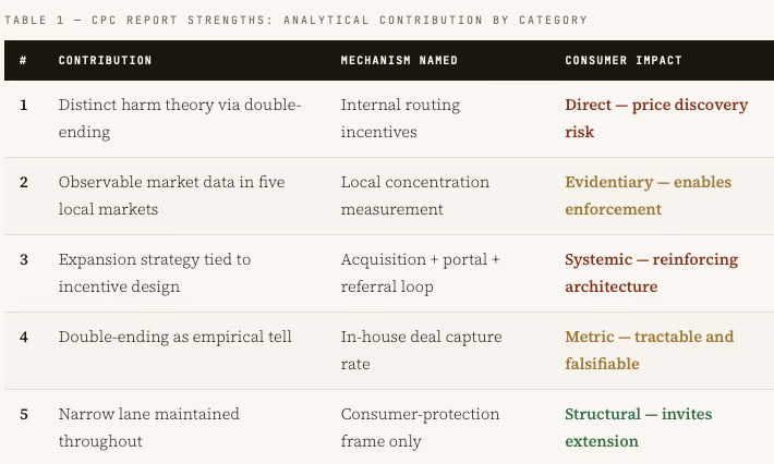 Consumer Policy Center’s report earns its place in the analytical record because Brobeck demonstrates discipline. Narrowing the field, naming a measurable mechanism, and supplying a consumer-protection frame more rigorous than the standard debate over private listings — centering double-ending as the key observable output of internal routing — constitutes a benchmark contribution that regulators and litigants can actually use.