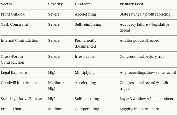 That is not a portfolio of independent risks. It is a compounding network. The congressional record becomes the goodwill impairment trigger. The state legislative ratchet becomes the profit deterioration mechanism. The internal contradiction becomes the cross-forum perjury trap. The cash constraint explains why the advocacy operation failed. Every vector connects to every other. None resolves without implicating the rest.