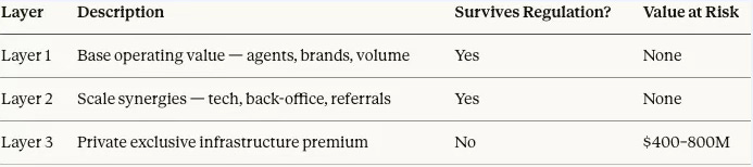 Layer 3 — Private Exclusive Infrastructure Premium. The third layer is where the acquisition math breaks down under regulatory pressure. Layer 3 is the value that exists only if the combined entity can hold listings off the open market long enough for an internal buyer to arrive first — capturing both commission sides on transactions that would otherwise split with a cooperating broker.