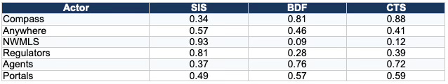 Compass exerts maximum destabilizing pressure on MLS coordination architecture. Its CTS (0.88) is the highest in the system, and combined with high BDF (0.81), Compass systematically deviates from stated commitments while generating coordination tension. NWMLS exhibits near-perfect strategic stability (SIS: 0.93, BDF: 0.09, CTS: 0.12). The merger would combine Compass’s drift architecture with national reach.