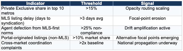 Observable indicators: Days-on-market variance exceeds 30% between MLS-listed and Private Exclusive properties. Consumer complaints regarding ‘hidden inventory’ spike in coastal markets. State AG investigations open in 3+ jurisdictions. Industry trade groups issue formal opposition statements. Buyer agent showing access complaints exceed 1,000/month nationally.