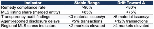 Observable indicators: Compass announces and then reverses transparency commitments within 12-month cycles. Executive turnover in compliance/legal functions exceeds industry norms. Shareholder pressure emerges regarding regulatory risk. Settlement discussions with DOJ/FTC or state AGs become public. MLS systems implement defensive rule changes.