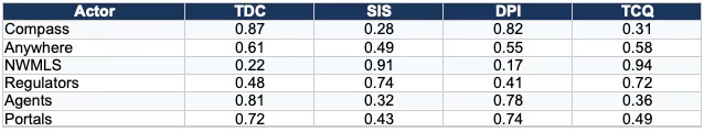 Six actors drive coordination dynamics in U.S. residential real estate: Compass, Anywhere, NWMLS, Regulators (federal and state), Agents, and Portals. Each receives full Cognitive Digital Twin quantification. Three additional actors—state AGs, local MLSs, and consumers—are modeled qualitatively where they intersect with primary actor dynamics.
