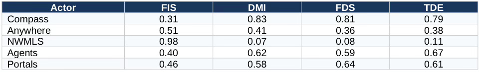 Compass operates as the primary source of information fragmentation. Its DMI (0.83) and FDS (0.81) represent the highest disclosure manipulation and focal-point distortion scores in the system. Combined with low FIS (0.31), Compass systematically undermines the shared visibility infrastructure that MLS systems provide. NWMLS anchors transparency with FIS of 0.98 and near-zero manipulation scores. Portals and Agents function as distortion channels rather than stability sources.