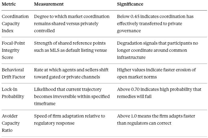 Forward-looking coordination analysis addresses the doctrinal gap by operationalizing coordination integrity as a measurable variable and identifying temporal thresholds beyond which competitive restoration becomes infeasible. Metrics such as the Coordination Capacity Index, Lock-In Probability, and Avoider Capacity Ratio quantify conditions that existing doctrine recognizes implicitly but cannot presently measure.