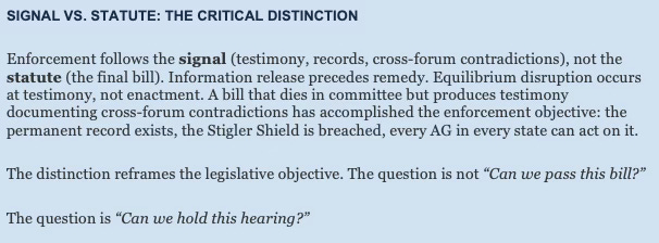 The signal-versus-statute distinction is the publication’s most original contribution. The conventional view treats legislation as the enforcement mechanism: the bill passes, the rule takes effect, compliance follows. The present analysis inverts that assumption. The enforcement mechanism is the testimony itself. The target is not the statute—it is the Stigler Shield: the structural information asymmetry that allows firms to maintain incompatible positions across forums without detection or consequence.