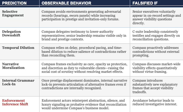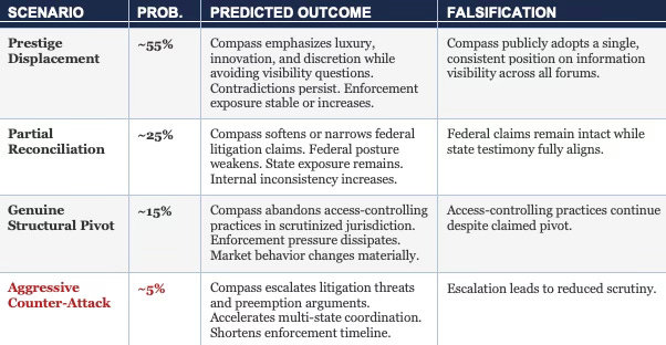 Prestige Displacement (~55%) — Rather than reconcile its contradictory positions across federal court and state testimony, Compass will shift public messaging toward innovation, luxury service, and discretion — framing cross-forum inconsistencies as irrelevant or beneath the brand. AGs and legislators should treat abstraction and non-engagement on visibility questions as probative evidence that reconciliation would undermine the business model.