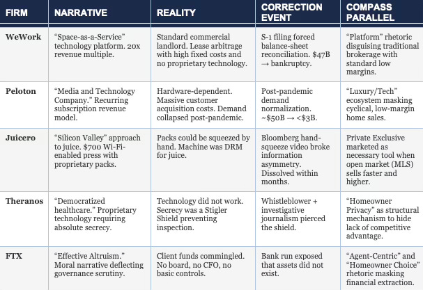 Historical Pattern: Narrative Inversion as Balance-Sheet Necessity. Compass’s narrative structure is not novel. Five high-profile firms have followed the same lifecycle: a valuation-driven company bridges the gap between its required capital-markets multiple (10x–20x, typical of technology platforms) and its actual operating economics (0.5x–2x, typical of service or commodity businesses) by deploying a narrative wrapper—“platform,” “community,” “innovation”—that disguises the underlying unit economics.