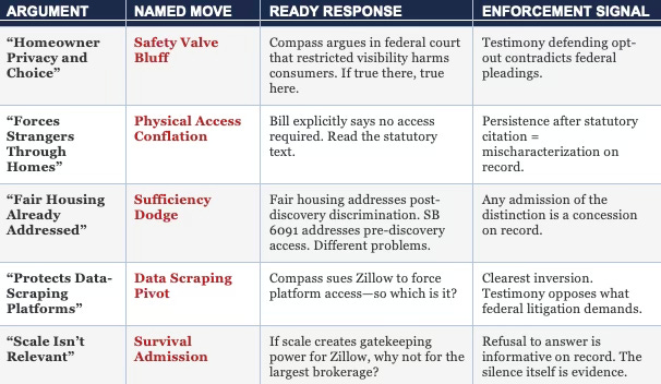 When access-controlling brokerages like Compass testify before state legislatures, they must reconcile contradictions they maintain across federal courts, state hearing rooms, and public marketing channels. That reconciliation—or the refusal to reconcile—generates an enforcement-grade evidentiary record regardless of whether the bill passes.