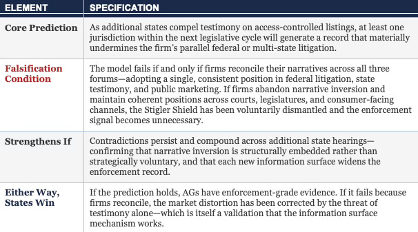 Testimony as Information Shock. The Stigler Shield persists because each institutional forum—federal court, state legislature, consumer-facing platform—operates with its own evidentiary record, its own audience, and its own standard of scrutiny. Legislative hearings function as a Stigler-disrupting information shock: they collapse forum boundaries by forcing real-time explanation in a public setting where legislators can surface, compare, and fix cross-forum claims into a single durable record. Federal litigants can discover that record. Other state legislatures can cite it. Every AG in every jurisdiction can access it.