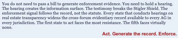 State attorneys general and legislators have an untapped mechanism for generating enforcement-grade evidence against access-controlling real estate brokerages—without requiring federal action and without depending on bill passage. The hearing record is the mechanism. The testimony is the evidence. The bill is secondary.