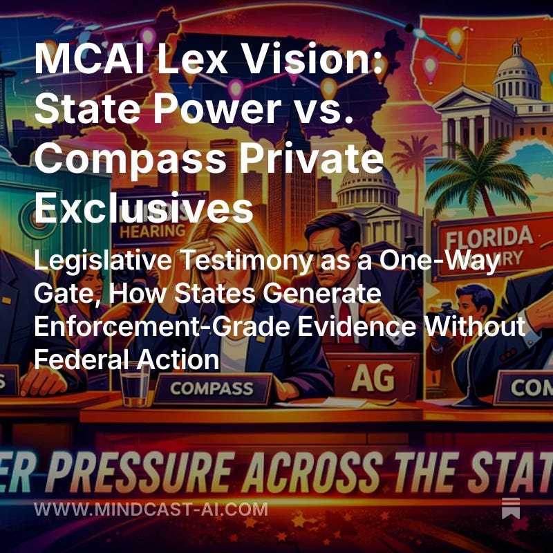CDT foresight simulation modeling how access-controlling firms adapt once legislative testimony collapses cross-forum separation. Runs six Vision Functions (Causation, Nash–Stigler Equilibrium, Installed Cognitive Grammar, Strategic Behavioral Coordination, Field-Geometry Reasoning, MindCast AI Foresight) to generate four probability-weighted scenarios with falsification criteria. Concludes that legislative testimony is a one-way gate: once crossed, narrative abstraction cannot restore equilibrium. Provides the monitoring guide for AGs and legislative staff to track which adaptive scenario is unfolding in their jurisdiction.