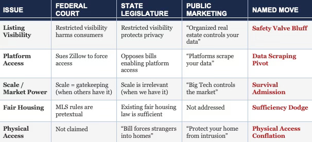 Narrative inversion is not a messaging error. Business models that require contradictory positions across different institutional forums make it a structural necessity. In federal litigation, the firm must frame restricted listing visibility as consumer harm to sustain antitrust claims against competitors. In state legislative hearings, the firm must reframe the same restriction as consumer protection to defeat transparency mandates. These contradictions are not accidental—they are the minimum viable strategy for maintaining a business model that depends on information control.