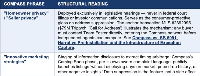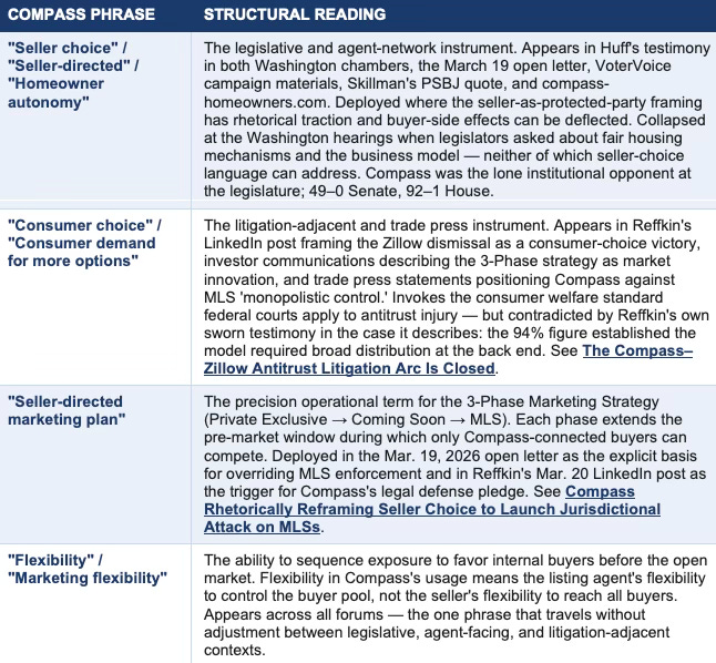 Table 1 separates the two phrase families Compass deploys across different forums. "Seller choice," "seller-directed," and "homeowner autonomy" are the legislative and agent-network instruments — they appear in hearing testimony, the open letter, agent-facing communications, and the VoterVoice campaign, and they collapsed under questioning when legislators asked about buyer access and the business model. "Consumer choice" and "consumer demand" are the litigation-adjacent instruments — they appear in Reffkin's trade press statements and investor communications, invoking the consumer welfare standard without the forum scrutiny that exposed the seller-choice framing. The structural reading of all three phrases in Table 1 is identical regardless of which instrument is deployed: the seller selects a pathway, the buyer pool is constrained, and the pre-market window stays open for internal buyers.