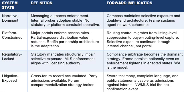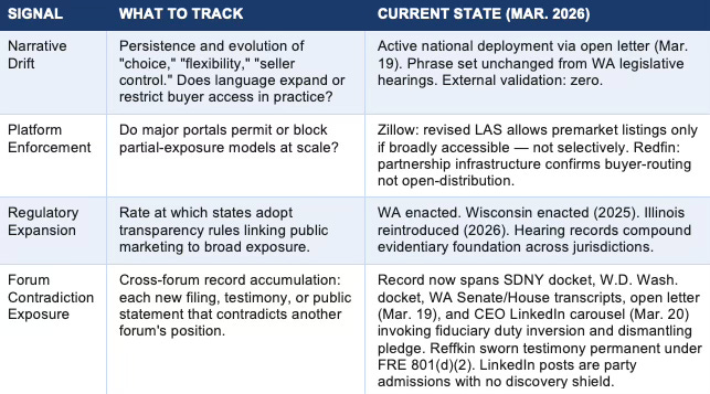 Washington’s SSB 6091 provides the clearest statutory articulation of the transparency rule: once a listing is publicly marketed, broad exposure becomes mandatory. Wisconsin enacted parallel restrictions in 2025; Illinois reintroduced equivalent legislation in 2026. Platform enforcement (Zillow, Redfin’s revised posture) aligns with this trajectory. Compass’s voluntary dismissal of the Zillow lawsuit on March 18, 2026 — the day before SSB 6091 was signed — reflects recognition of an exhausted constraint boundary, not a change in underlying strategy. On March 20, 2026 — the morning after signing — Reffkin published a LinkedIn carousel invoking fiduciary duty to reframe MLS enforcement as interference with professional obligation, and pledging to dismantle ‘any system that stands in the way of that mission.’ The record is live and compounding.