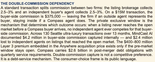 The consumer-choice frame exists to protect a single revenue mechanism: double-commission capture. When a listing circulates privately before the open market, the buyer pool is constrained to agents inside the Compass network — and the listing agent is positioned to represent that buyer, capturing both commission sides on the same transaction. On a $15M property that is $750,000 to the same agents. At scale across 37,000 agents and $2.6 billion in post-merger debt obligations, it is a solvency mechanism, not a seller service.