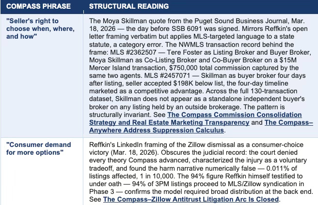 The Skillman Moment — Moya Skillman’s PSBJ quote applying Reffkin’s MLS-targeted framing to SSB 6091 — is the canonical field test case for this table. The quote demonstrates both the internal coherence of the frame (it works for agents operating inside the Compass incentive structure) and its external failure (it does not hold when applied to a statutory requirement grounded in consumer protection and enforced through licensing authority). The transaction record behind the Skillman Moment is documented in The Compass Commission Consolidation Strategy and Real Estate Marketing Transparency and The Compass–Anywhere Address Suppression Calculus. Use the Skillman Moment as the calibration reference when evaluating any new deployment of the frame.