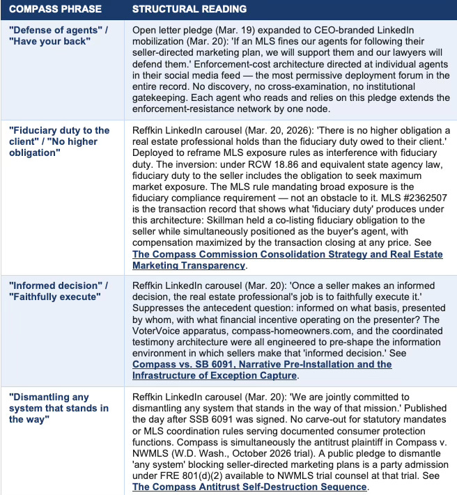 Apply these tables to any Compass communication — legislative testimony, press release, court filing, LinkedIn post, open letter — to translate the consumer-choice frame into its operational meaning. Each table groups phrases by function. The four groups are: the core operational vocabulary that names the mechanism; the concealment layer that provides public-interest cover; the field evidence where named actors deployed the frame against a documented transaction record; and the March 20, 2026 LinkedIn escalation, which introduced fiduciary duty inversion and is now the most legally exposed cluster in the permanent record.