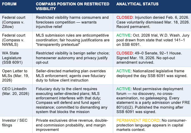 The pattern documented across the Zillow litigation arc and the Washington legislative record is consistent: consumer-protective language appears in legislative hearings and public media — forums without discovery, cross-examination, or judicial evidentiary gatekeeping. That language disappears in every venue equipped to test it. This asymmetry is the central analytical finding of The Compass Narrative Inversion Playbook, and its evidentiary foundation is documented in Compass’s Cross-Forum Contradictions.