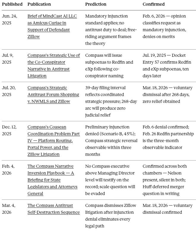 Four predictions remain active and falsifiable: NWMLS Notice of Supplemental Authority citing the eXp deal (deadline April 4, 2026); California no-opt-out concurrent marketing bill citing the Redfin contract (Q3 2026); CFPB RESPA preliminary inquiry into the Rocket–Compass–Redfin structure (Q3 2026); Anywhere acquisition goodwill impairment as a timing question at the next audit cycle. Each will either confirm or falsify the framework publicly and on the record.