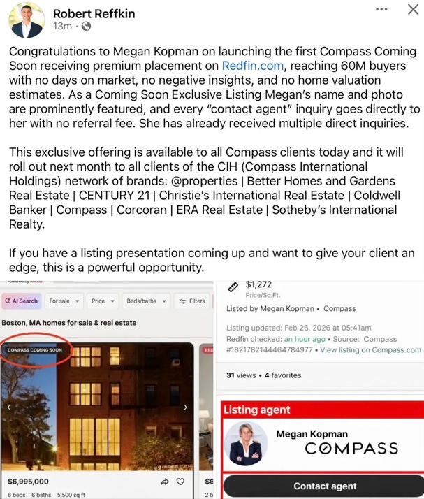 The post congratulates Megan Kopman on “launching the first Compass Coming Soon receiving premium placement on Redfin.com, reaching 60M buyers with no days on market, no negative insights, and no home valuation estimates.” Every “contact agent” inquiry routes directly to Kopman “with no referral fee.” The post then announces the mechanism will “roll out next month to all clients of the CIH (Compass International Holdings) network of brands: @properties | Better Homes and Gardens Real Estate | CENTURY 21 | Christie’s International Real Estate | Coldwell Banker | Compass | Corcoran | ERA Real Estate | Sotheby’s International Realty.” The closing line: “If you have a listing presentation coming up and want to give your client an edge, this is a powerful opportunity.”