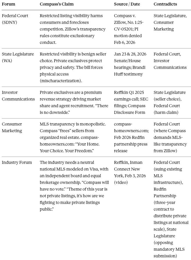 Compass operates simultaneously in at least four institutional forums, each demanding a different account of how its private exclusive model affects competition and consumer welfare. MindCast AI publications spanning January through February 2026 documented the positions Compass advanced in each. Assembled together, the contradictions form a matrix where each row cancels at least one other.