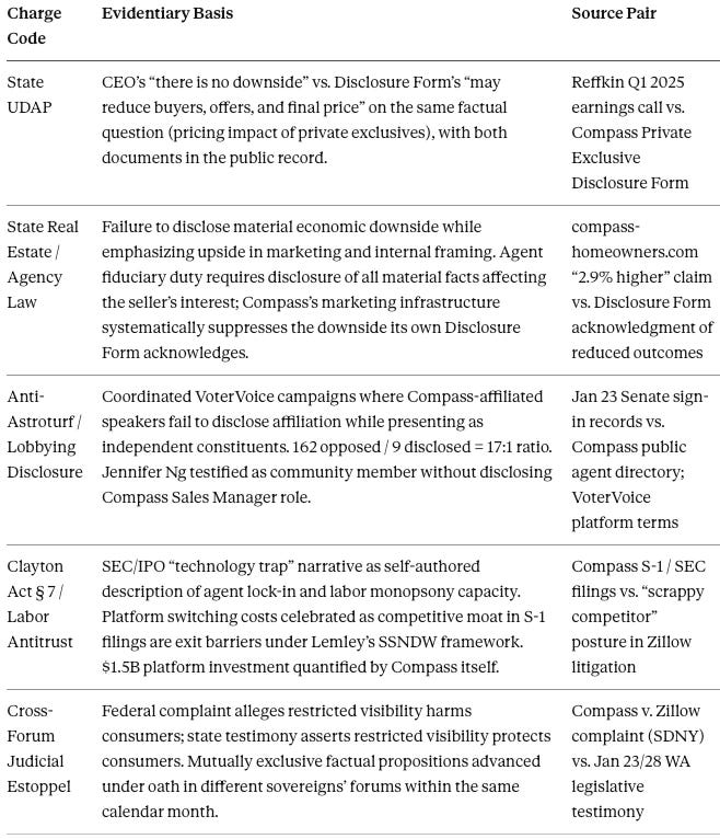 **The core finding: **Compass does not merely shift emphasis across forums. Compass advances factual propositions in one venue that, if true, destroy its own claims in another. Restricted visibility either harms consumers (as Compass pleads in SDNY) or protects consumers (as Compass testified in Olympia). Private exclusives either require regulatory protection because they serve sellers (legislative argument) or require antitrust relief because competitors suppress them (litigation argument). The company’s own Disclosure Form acknowledges that private exclusive marketing “may reduce the number of potential buyers,” “may reduce the number of offers,” and may reduce “the final sale price.” CEO Robert Reffkin’s public statement: “There is no downside.” Both documents are in the public record. The gap between the CEO’s statement and the company’s own client disclosure—on the same factual question—constitutes the deceptive trade practices exposure under state UDAP statutes.
