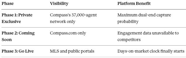 The strategy holds listings off public coordination infrastructure during the critical early-marketing period when buyer interest peaks. Sequestration increases the probability that both buyer and seller originate within the Compass network, enabling dual-end commission capture. The strategy cannot survive SB 6091 as written—hence the apparatus to secure the opt-out amendment.
