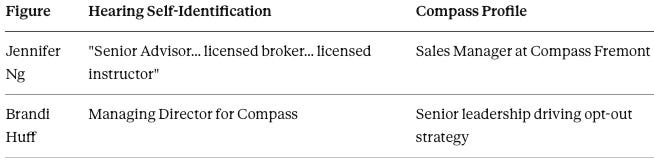 Insight: Jennifer Ng is Sales Manager at Compass Fremont. She did not identify herself as a Compass Sales Manager during testimony. She listed every credential from her Compass bio—except Compass itself.