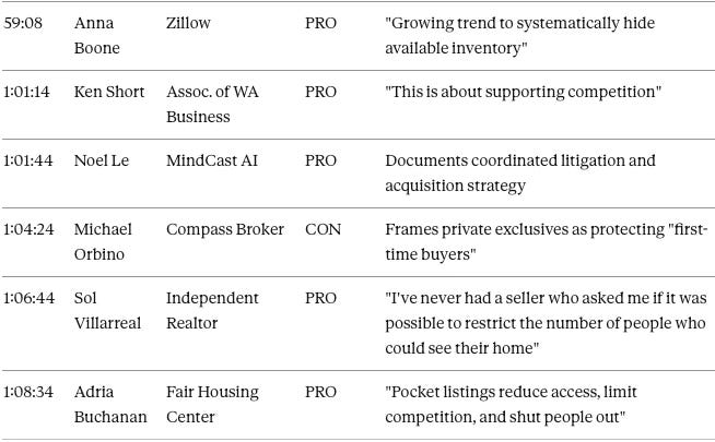 Sol Villarreal, an independent Seattle realtor since 2014, testified to what the apparatus’s “seller choice” narrative obscures: