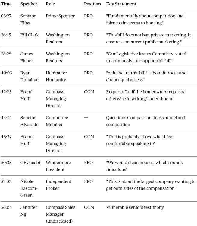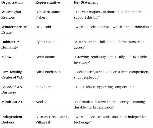 Insight: Windermere—the firm with the most to gain from private listings—testified for SB 6091. Compass—the firm with $2.5 billion in debt—testified against. The divergence is not about values; it is about balance sheets.