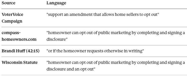 Insight: Four independent sources—VoterVoice, compass-homeowners.com, Brandi Huff’s testimony, and the Wisconsin statute—converge on identical opt-out language. The convergence did not require coordination. The apparatus was designed to produce it.