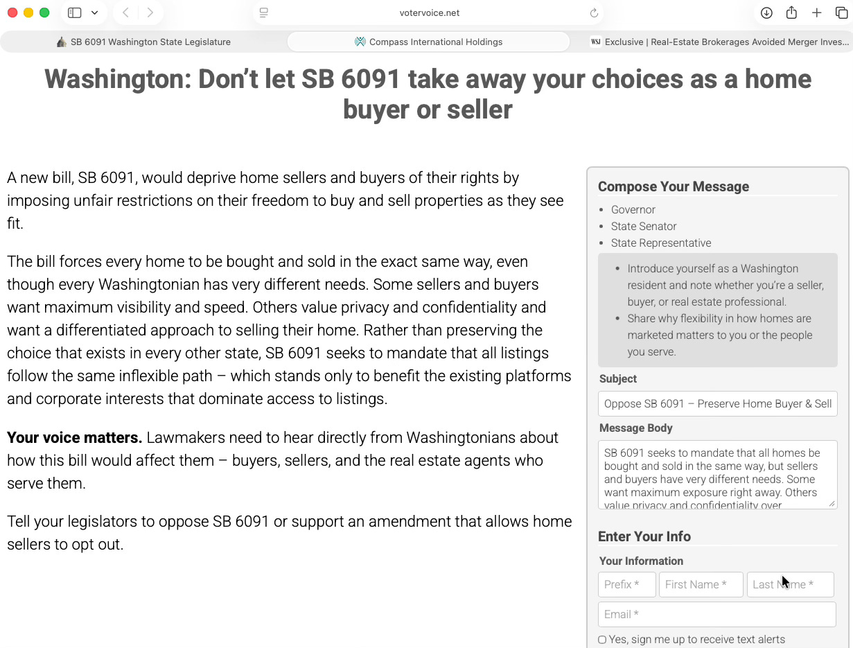 Framing Architecture: “Don’t let SB 6091 take away your choices as a home buyer or seller” positions a transparency bill as an attack on consumer freedom—the same inversion that characterizes the compass-homeowners.com messaging.