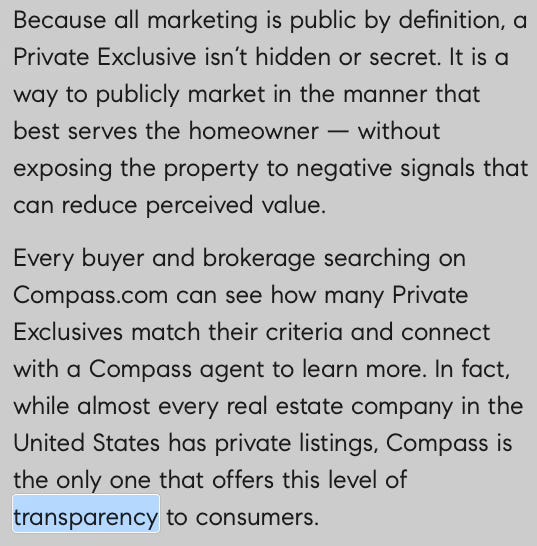 The statistics compare Compass-sold homes to other Compass-sold homes—not to the broader market. Selection bias is embedded in the methodology: sellers who opt for private exclusives may systematically differ from those who choose public marketing (higher-value properties, more motivated sellers, luxury segment concentration). The study cannot isolate the effect of private marketing from the characteristics of sellers who choose it. Compass presents correlation as causation while the fine print disclaims: “Correlation does not necessarily equal causation.” The claim is marketing collateral designed to normalize inventory sequestration, not evidence that private listings serve sellers.