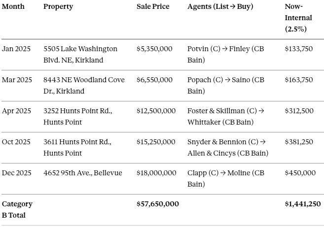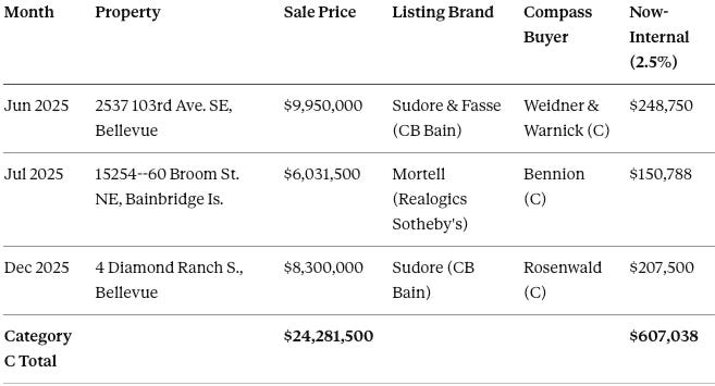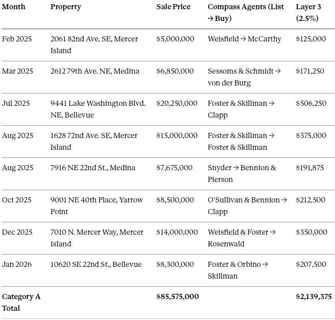 Category A is the Layer 3 mechanism in its purest form. These are transactions where Compass held the listing and a Compass agent also represented the buyer — capturing both the listing-side and buyer-side commission inside a single firm. No cooperating brokerage. No outside agent. Both halves of the commission flow to the same balance sheet. All role designations are sourced from NWMLS transaction records. All transaction values are sourced from Seattle Agent Magazine monthly reports. Both are independently verifiable. In the ultra-luxury segment, where buyer-side commissions routinely exceed $200,000, eight such transactions in thirteen months represent the architecture operating without friction.