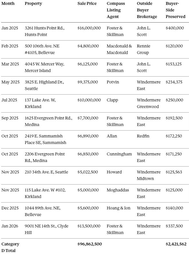Category D is not a competitive failure for Compass. It is the open-market outcome the private exclusive model is engineered to prevent — and the $2.4 million it represents is the most direct quantification of what sellers lost access to when the mechanism operated successfully in Categories A, B, and C. These are Compass listings that reached the open market — and as a result, an independent buyer's agent competed for and won the buyer-side commission. From a consumer protection standpoint, Category D is the success case: competition functioned, an outside agent served the buyer, and the seller’s listing received full market exposure. From Compass’s Layer 3 standpoint, each Category D transaction is $150,000 to $400,000 in buyer-side commission that left the network. The private exclusive model exists to convert these outcomes into Category A outcomes.