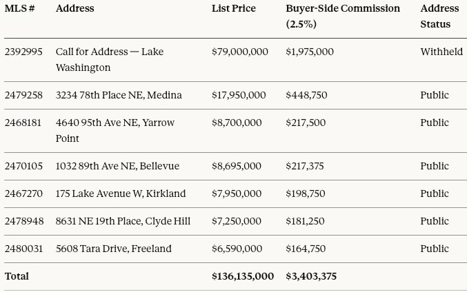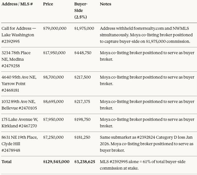MLS #2392995 — the $79,000,000 Lake Washington estate currently listed without an address — is the highest-stakes prospective transaction in the dataset. At 2.5% buyer-side commission, $1,975,000 turns on who represents the buyer at closing. The address suppression documented on February 19, 2026 is the mechanism that narrows the buyer pool to those who contact Team Foster directly. The closing record will show whether that narrowing produced an internal buyer.