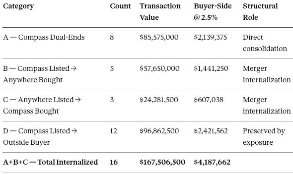 Five transactions where Compass held the listing and a Coldwell Banker Bain agent brought the buyer. Before the acquisition, that buyer-side commission was competitive revenue leaving the firm. After the acquisition, it stays inside the combined entity. Nothing changed in the transaction. The merger changed the accounting.