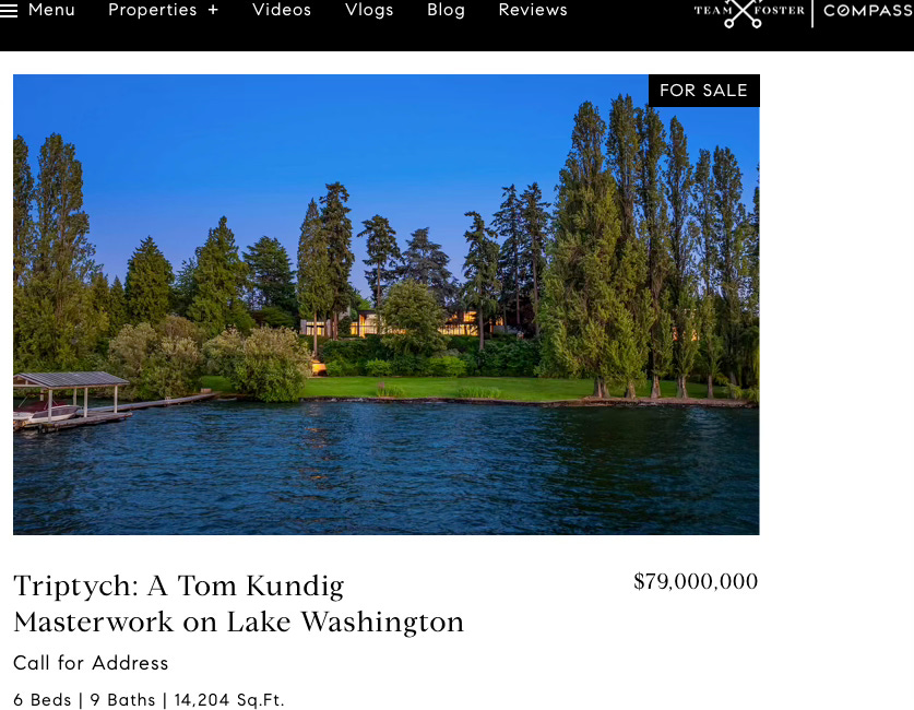 The most significant is MLS #2392995 — “Triptych: A Tom Kundig Masterwork on Lake Washington” — listed at $79,000,000 with one field reading “Call for Address.” The property is marketed publicly on fosterrealty.com with price, photographs, and specifications: 6 beds, 9 baths, 14,204 square feet. The address is withheld. Any buyer seeking to identify, locate, or visit the property must contact Team Foster directly — entering the Compass internal routing network before any independent buyer’s agent can identify the property, show it to their clients, or compete for the buyer-side representation.