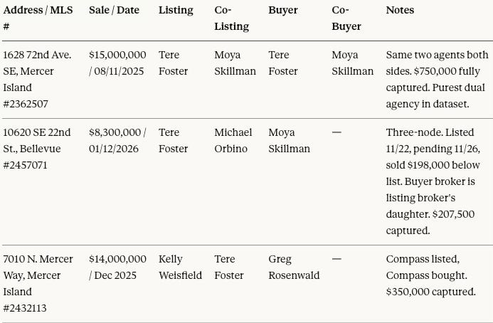 The December 2025 Mercer Island transaction at 7010 N. Mercer Way (MLS #2432113) shows the architecture operating through a different configuration. Kelly Weisfield of Compass held the listing. Tere Foster co-listed. Greg Rosenwald of Compass represented the buyer. Three Compass agents, two of them from Team Foster's own network, on a $14,000,000 transaction. The $350,000 buyer-side commission stayed inside one firm. No family relationship required. No three-node structure required. Platform-level network density produced the same commission destination through a different personnel configuration.