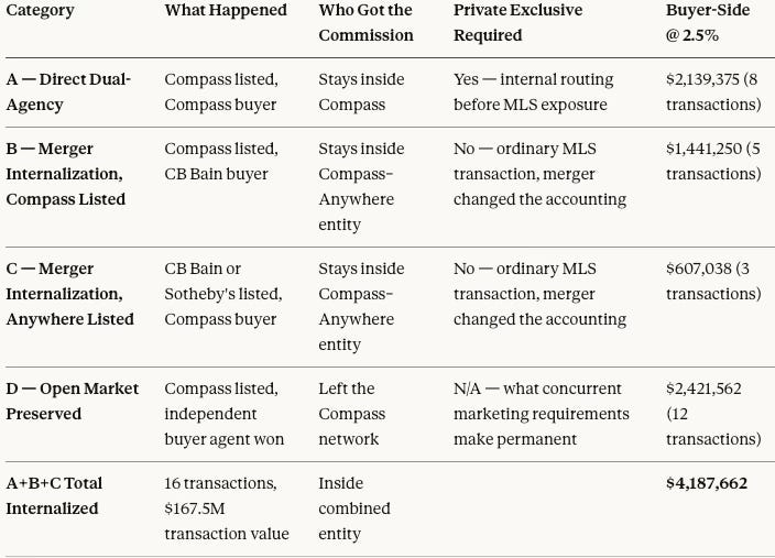 Category B requires no private exclusive behavior to explain. These are ordinary cooperative transactions — a Compass listing agent, a CB Bain buyer agent, an MLS-exposed sale — that became internal revenue the moment the merger closed. The agents involved did nothing differently. Their clients experienced nothing differently. But the commission that previously crossed corporate lines now stays inside the combined entity. This is the merger as commission-transfer mechanism, operating invisibly at the transaction level.