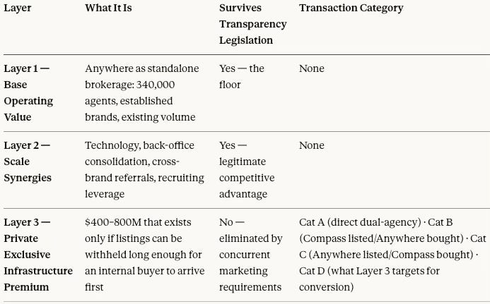 Layer 3 — Private Exclusive Infrastructure Premium: The value that exists only if the combined entity can hold listings off the open market long enough for an internal buyer to arrive first — capturing both commission sides. Two mechanisms compound this layer. Direct dual-agency: Compass holds the listing and routes a Compass buyer before any outside buyer sees it. Merger internalization: transactions that previously crossed firm lines — a Compass listing sold by a Coldwell Banker Bain buyer agent —now stay inside the combined entity without any change in conduct.
