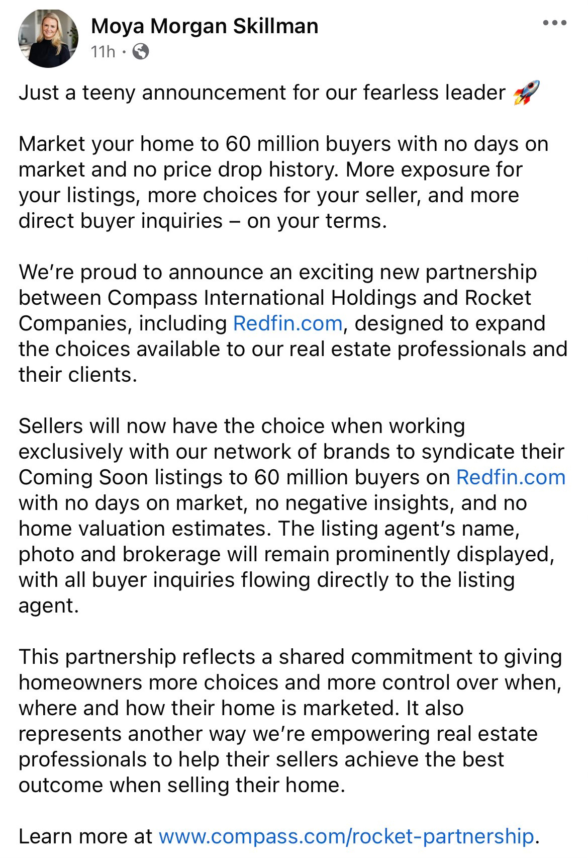Compass broker Moya Morgan Skillman, Team Foster, announces the Redfin partnership on February 26, 2026 — framing suppressed buyer data as a seller benefit and routing all inquiries to the listing agent. Public Facebook post.