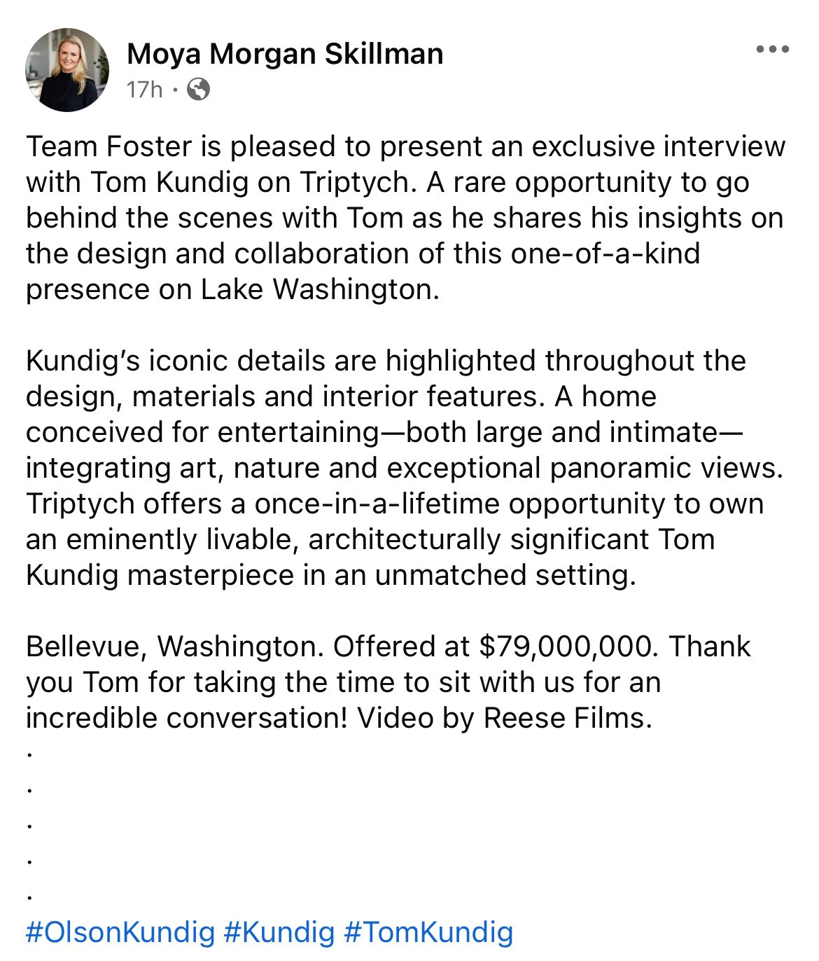 Skillman markets MLS #2392995 — the $79 million Lake Washington estate documented in the Address Suppression Calculus as Team Foster's anchor suppression listing — through an exclusive architect interview designed to generate internal buyer inquiry before broad market exposure. Public Facebook post, February 26, 2026.