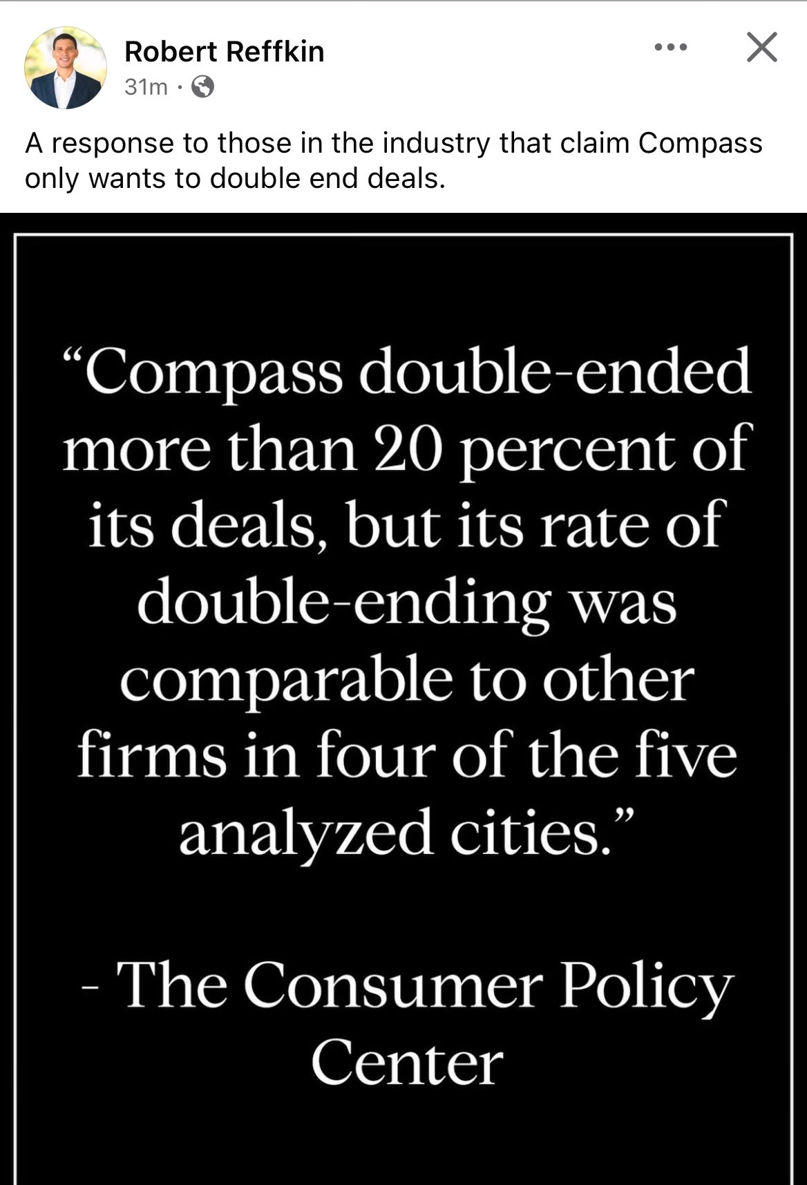 Robert Reffkin posted a quote card on his personal Facebook account on April 16, 2026, captioned: “A response to those in the industry that claim Compass only wants to double end deals.” The quote card extracted one sentence from the Consumer Policy Center’s April 2026 Compass expansion report: “Compass double-ended more than 20 percent of its deals, but its rate of double-ending was comparable to other firms in four of the five analyzed cities.” Attribution on the card: “The Consumer Policy Center.”