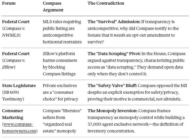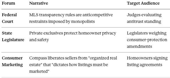 Compass’s antitrust posture collapses under cross-forum scrutiny: when forced to explain its business model outside federal court, the firm advances mutually incompatible theories of competition. The contradiction is not accidental. It is a deliberate strategy of narrative arbitrage: framing the same business practice as pro-competitive innovation, consumer privacy protection, or anti-monopoly rebellion depending on which story serves the immediate objective.