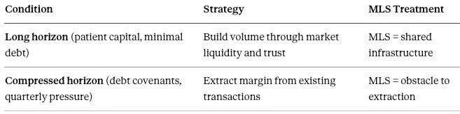 Windermere described the MLS as shared market infrastructure—an information commons that lowers transaction costs, broadens participation, and constrains even the largest firms from hoarding inventory. Windermere can afford that position because the firm carries no debt service pressure forcing quarter-to-quarter margin extraction.